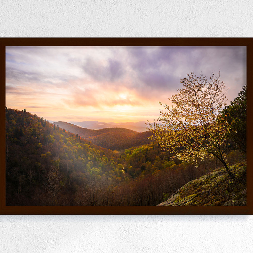 The early buds of spring begin to appear along the Blue Ridge Parkway as the morning sun engulfs the Blue Ridge Mountains in golden light.